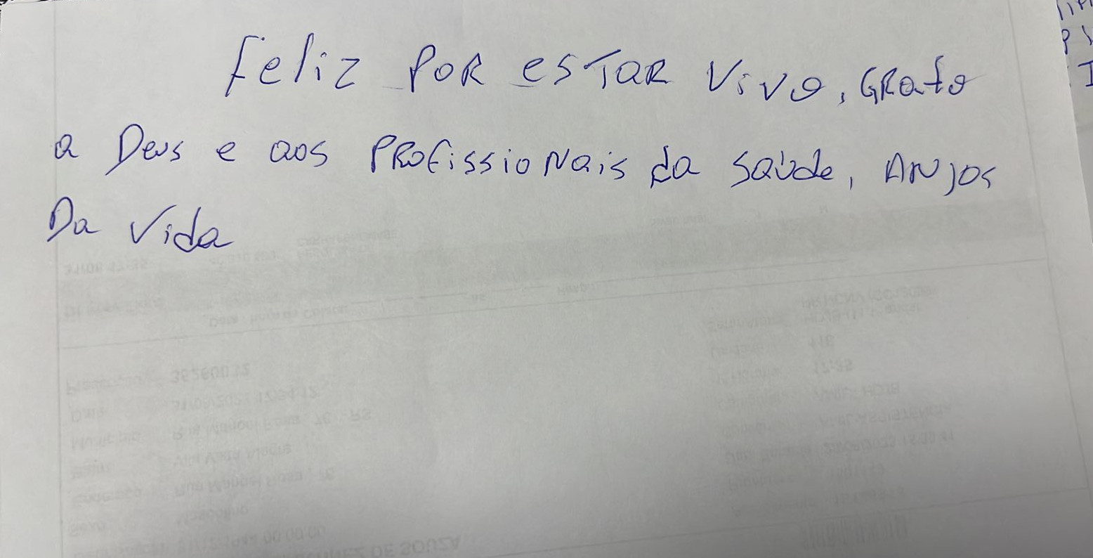 ALÉM DAS PAREDES - Pego de surpresa com o passeio proposto, Rodrigo não escondeu sua alegria ao ver novamente o mundo do lado de fora das paredes do hospital. Tanto que fez questão de escrever um bilhete para a equipe assistencial. “Feliz por estar vivo! Grato a Deus e aos profissionais da saúde, anjos da vida”, diz o rascunho.